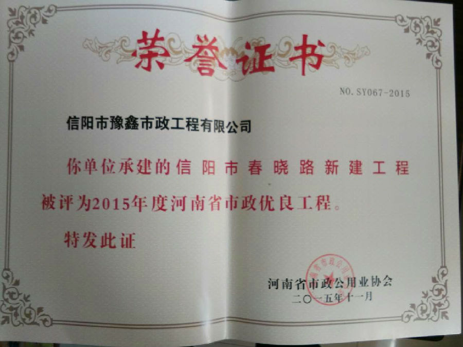 好風憑借力,送我上青云。近年來,公司積極參與城市市政基礎設施建設施工,積極參與市場競爭,先后承擔施工了市政府重點工程南京路道路改造工程、春曉路道路改造工程,東方紅大道道路改造工程、龍江東路新建工程等重點民生工程,其中南京路道路改造工程被省建設廳評為“中州杯”, 春曉路和東方紅大道道路改造工程被省建設廳評為“省優工程”,成為城區一道道亮麗的風景線。參與施工了市典范小區“臺北城上城”、“恒大名都”以及師范學院、職業技術學院、交警支隊和軍區道路工程,參與施工了雞公山管理區、南灣管理區、明港鎮和羅山縣等部分道路小區工程施工,累計大小各類施工工程三百余項,企業影響力不斷擴大、輻射力不斷增強,市場份額不斷提高,企業信譽不斷彰顯,為信陽城市建設做出了積極貢獻,為企業的可持續發展插上了騰飛的翅膀。